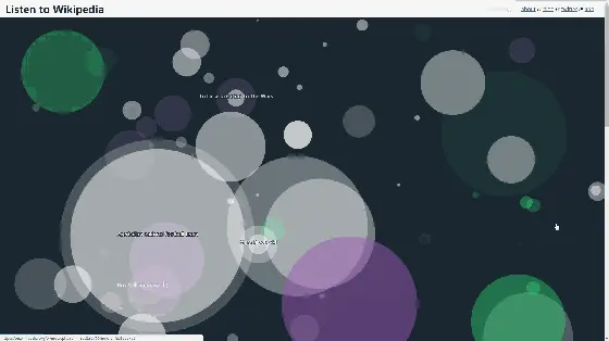 这个信息图表显示了哪些词条正在被实时编辑。当一个词条被编辑的时候,点在屏幕上闪烁并消失,每个点都是编辑日志的链接。然而,更有趣的是,一个音符伴随着每一个出现的圆点一起演奏,敲击出一个不断变化的旋律。