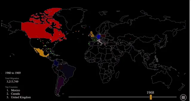 地图上的彩色圆点在一个黑色背景下移动,每个圆点代表大约1万人。这些点从原籍国飞到美国,而在底部的时间轴则逐渐向前移动。时间轴可以手动移动,以查看历史上不同的时间。左边的记录器显示了哪些国家在什么时候将最多的人送到美国。