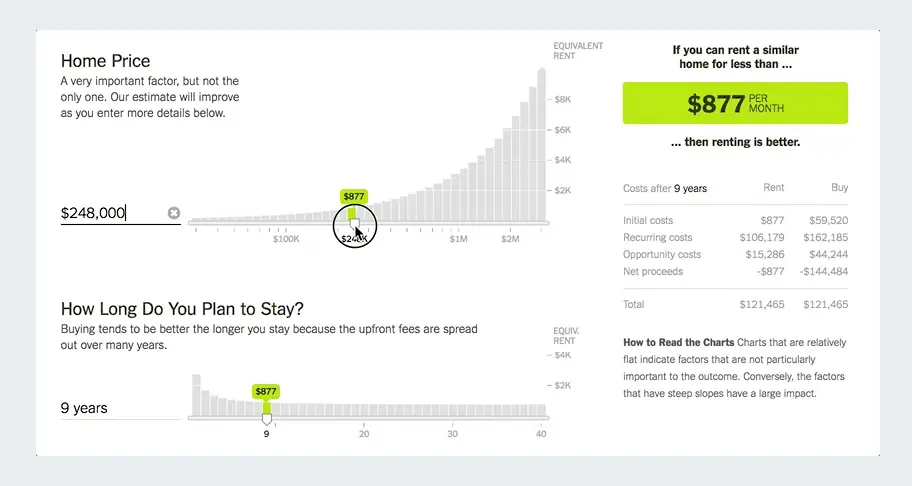 Mike Bostock, Shan Carter和Archie Tse开发了一个预算计算器来帮助潜在的房主们知道究竟是租房好还是直接买房好。