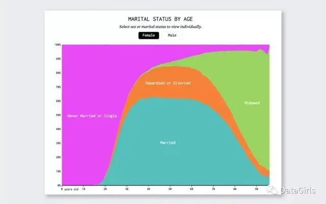 Nathan Yau可能提供了整个列表中最色彩鲜艳的可视化。它和标题所暗示的一样,其中的明亮的部分代表每个年龄段的人是单身/从未结婚、已婚、分居/离婚或丧偶的人数。读者可以切换男性和女性的统计数据进行比较。
