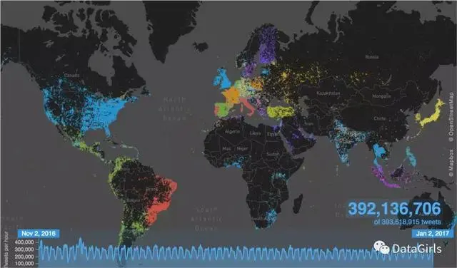 “推特地图”(Tweet Map)是一张世界地图,它展示了哪些国家在Twitter上都谈论什么主题,以及它的数量。顶部的搜索栏允许用户查找特定的关键字和标签,而底部的图表则允许用户查看在Twitter活动中高峰和低谷。
