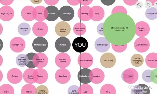 McCandless创建了一个窗口,在其中输入出生日期,系统即可开始计算。随后“我们”被置于一张根据年龄所产生的特定图表中。我们的圆圈置于我们现在的年龄线上,,其他的圆圈围绕着我们,写满了不同名字,分布在不同年龄线上。点击这些圆圈就能显示那个人在相应年龄时已经完成什么事。