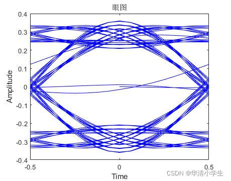 简单看一下信号的时域波形和频域波形,你可能看不出来什么,尤其是时域图,真让人一言难尽,但是眼图就好多了,看这卡姿兰大眼睛,眼图是观察信号的一种手段,从“眼睛”张开的程度和饱满性来判断信号的好坏,“眼睛”睁开的越大,越饱满代表信号越好,这跟我们现实生活一样,谁不喜欢水汪汪的大眼睛。你可能注意到我们观察眼图时是从[49:end],这一点便是滚降滤波的原因,由于滤波器的作用,信号延迟了48,这点呼应我上边让你记住的(6*16)/2=48,后边我们还会涉及到这个。如果不处理信号的延迟,那么眼图就会是下边这样,“眼睛”里出现了“红血丝”,那肯定是熬夜过渡了。