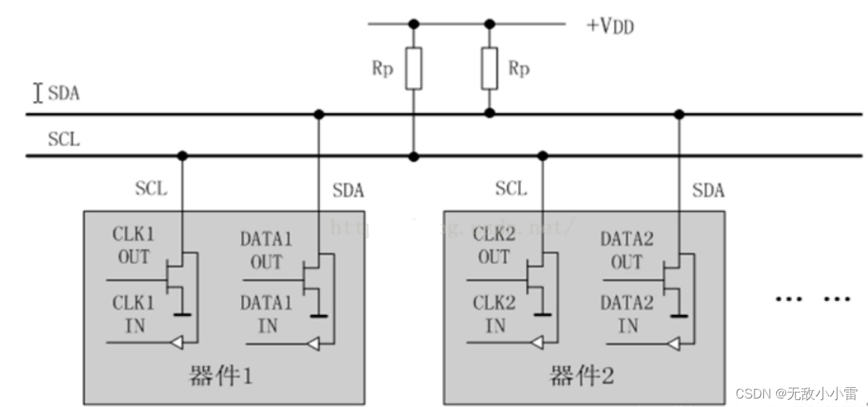 我们可以看到,在上图中数据线与时钟线都上拉了一个电阻。为什么要怎么做呢? 因为,IIC内部的SCL与SDA都被设计成开漏的,此时IIC如果想要输出高电平,那就必须外接一个上拉电阻,否则无法输出高电平。