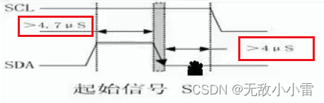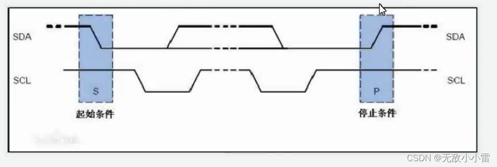 起始条件:SCL为高电平期间,SDA由高电平跳变到低电平,产生一个有效的下降沿