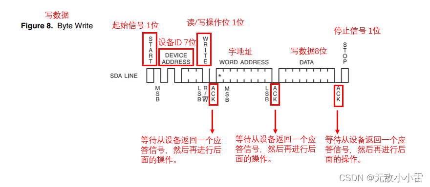 注意:图中的写数据操作是主芯片向EEPROM写数据,然后主芯片等待EEPROM返回一个应答信号。