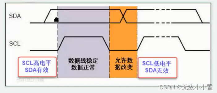 注意:在SCL为低电平的时候,才允许SDA发生改变。这是因为,当SCL为低电平的时候,SDA的一切电平状态都会被视为无效电平,此时改变SDA不会对其他的任何设备产生影响。然后我们等SDA的电平稳定了以后,再拉高SCL,那么此时SDA的这个稳定后的电平状态就会被视为有效的电平。