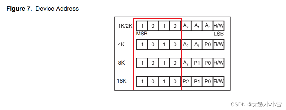 这个是设备的ID(即:从设备地址),我们可以看到不同容量的存储设备,它们的ID的高4个位都是1010开头,只有A2、A1、A0是设备的ID,最后一位R/W是读/写位。所以,表达地址的就只有7位,即:1010 A2 A1 A0