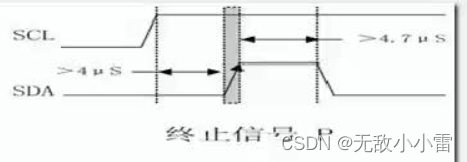 停止条件:SCL为高电平期间,SDA由低电平跳变到高电平,产生一个有效的上升沿