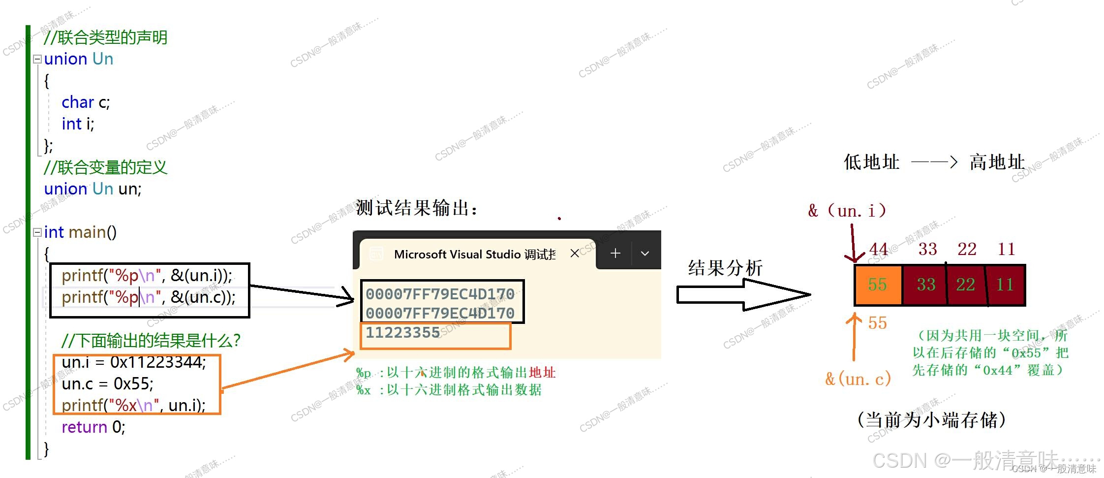 这种类型定义的变量也包含一系列的成员,特征是这些成员公用同一块空间(所以联合也叫共用体)。