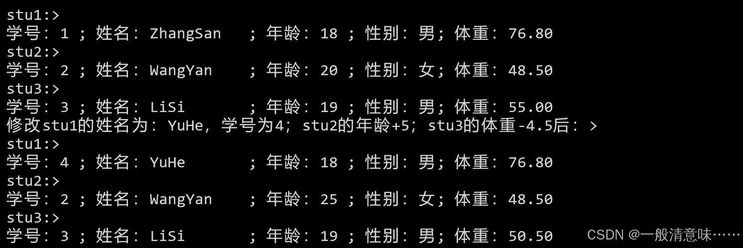 printf("修改stu1的姓名为:YuHe,学号为4;stu2的年龄+5;stu3的体重-4.5后:>\n");
