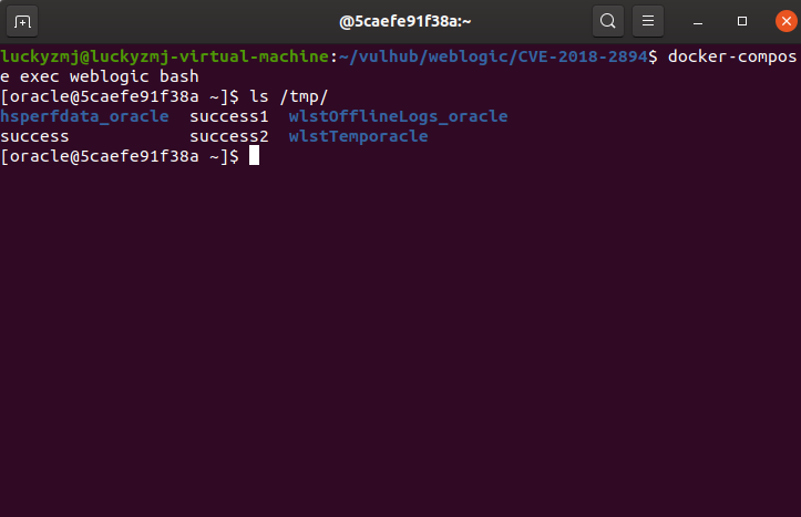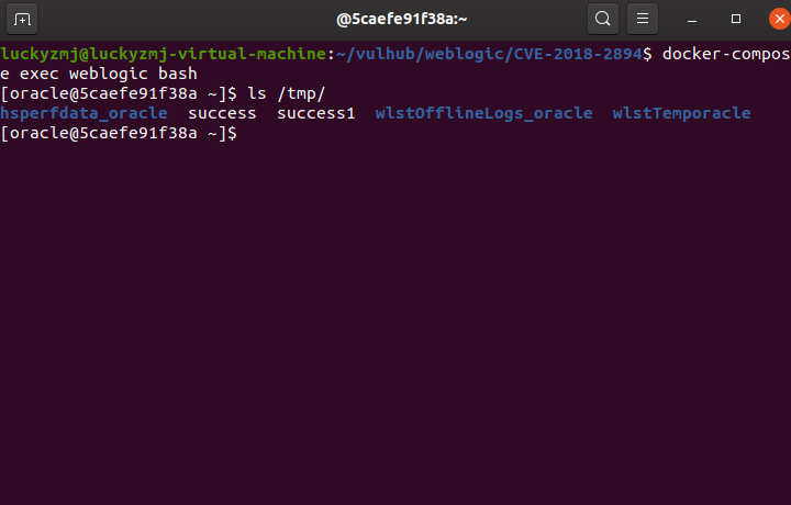 执行docker-compose exec weblogic bash进入容器中,可见/tmp/success1已成功创建。