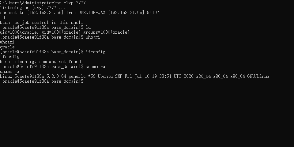 在攻击者主机上成功接收到反弹的shell