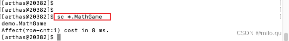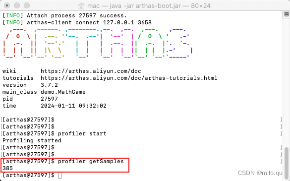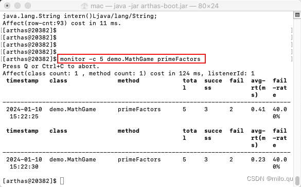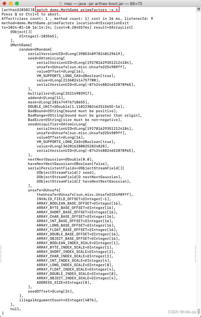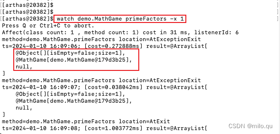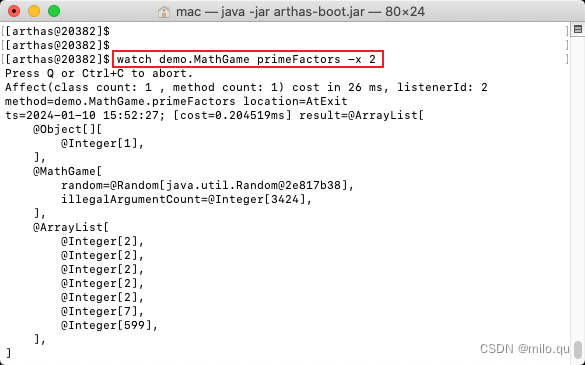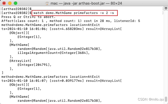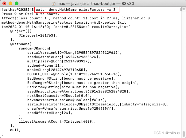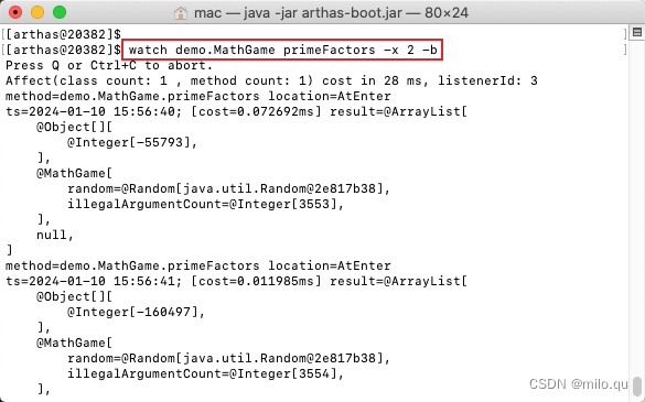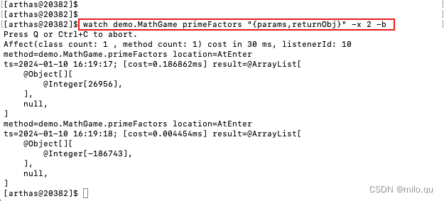 命令:watch demo.MathGame primeFactors "{params,returnObj}" -x 2 -b