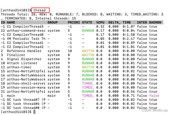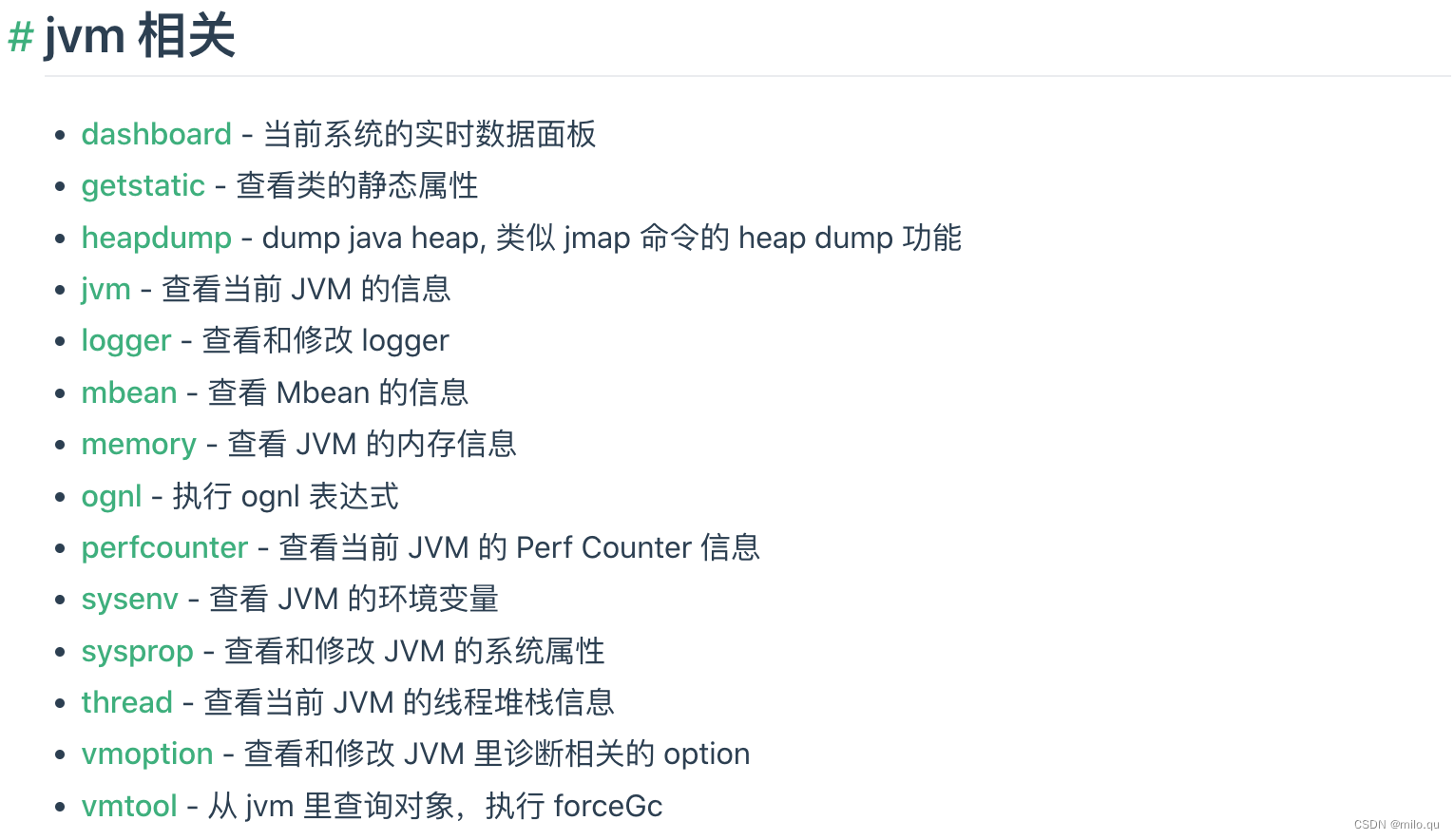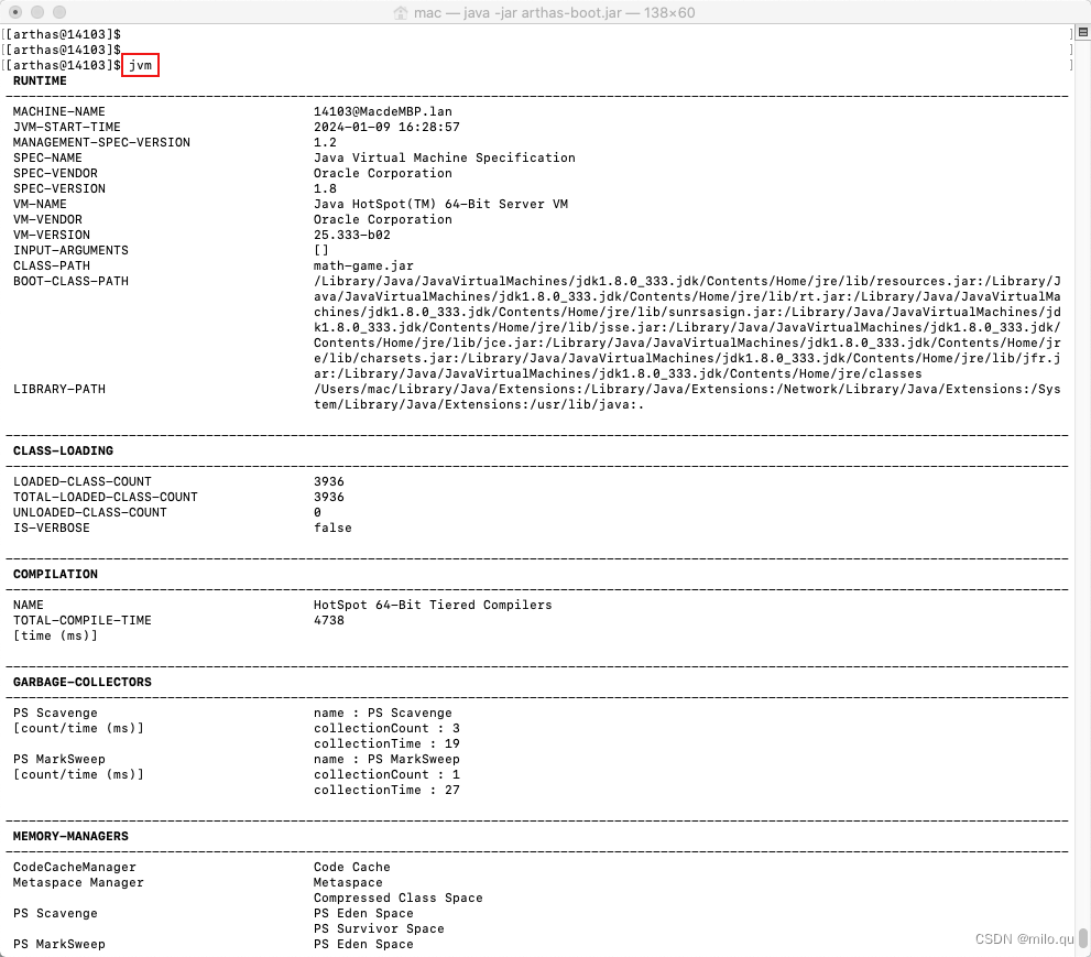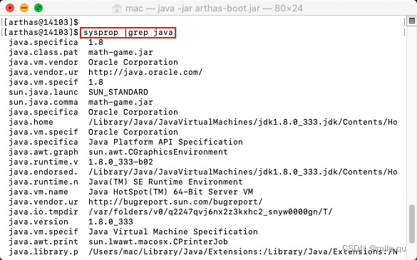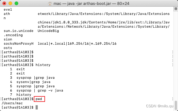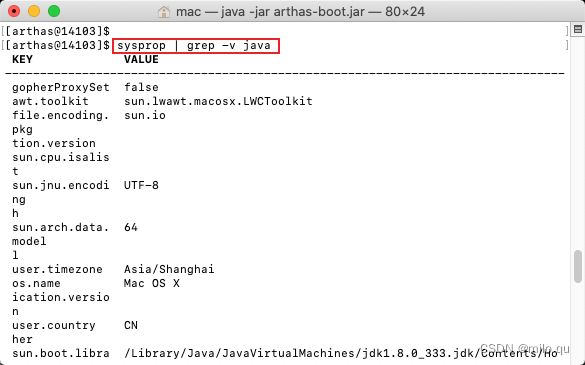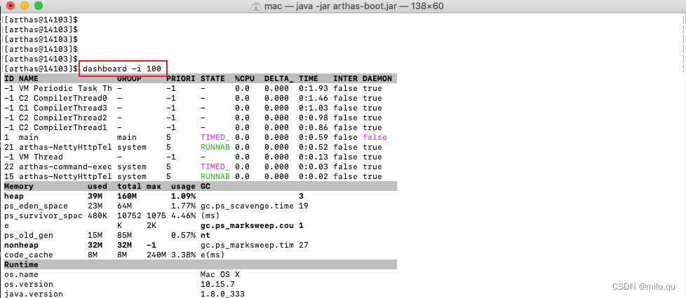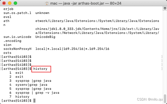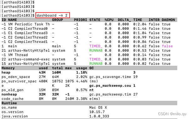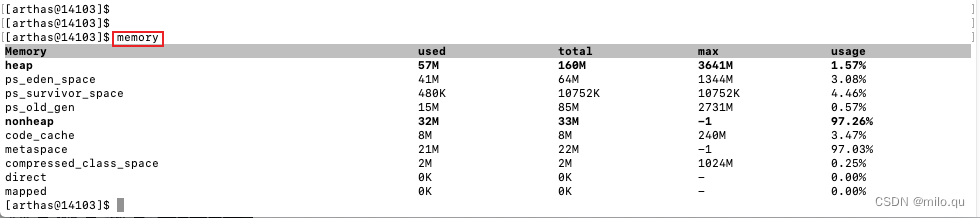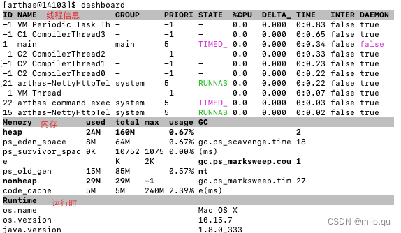 一、arthas介绍3.选择监控哪个进程4.进入具体进程二、arthas的基础命令与基本操作1.查询包含Java的系统属性:命令:sysprop |grep java1.查询不含Java的系统属性:命令:sysprop | grep -v java3.打印历史命令命令:history4.查看当前工作目录命令:pwd三、如何使用arthas监控线上服务的内存状态1.dashboard - 当前系统的