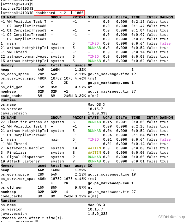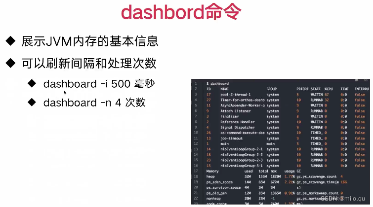 命令:dashboard -n 2 -i 1000 每1秒刷新一次共刷新两次