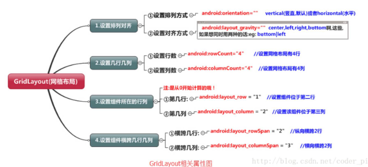 先定义组件的对其方式 android:orientation 水平或者竖直,设置多少行与多少列