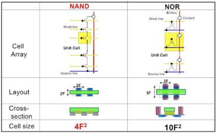 NOR 和 NAND 闪存在架构和设计特性上有所不同。 NOR 闪存不使用共享组件,可以并行连接各个存 储单元,从而可以随机访问数据。 NAND 闪存单元更紧凑,位线更少,将浮栅晶体管串联在一起以 提高存储密度。