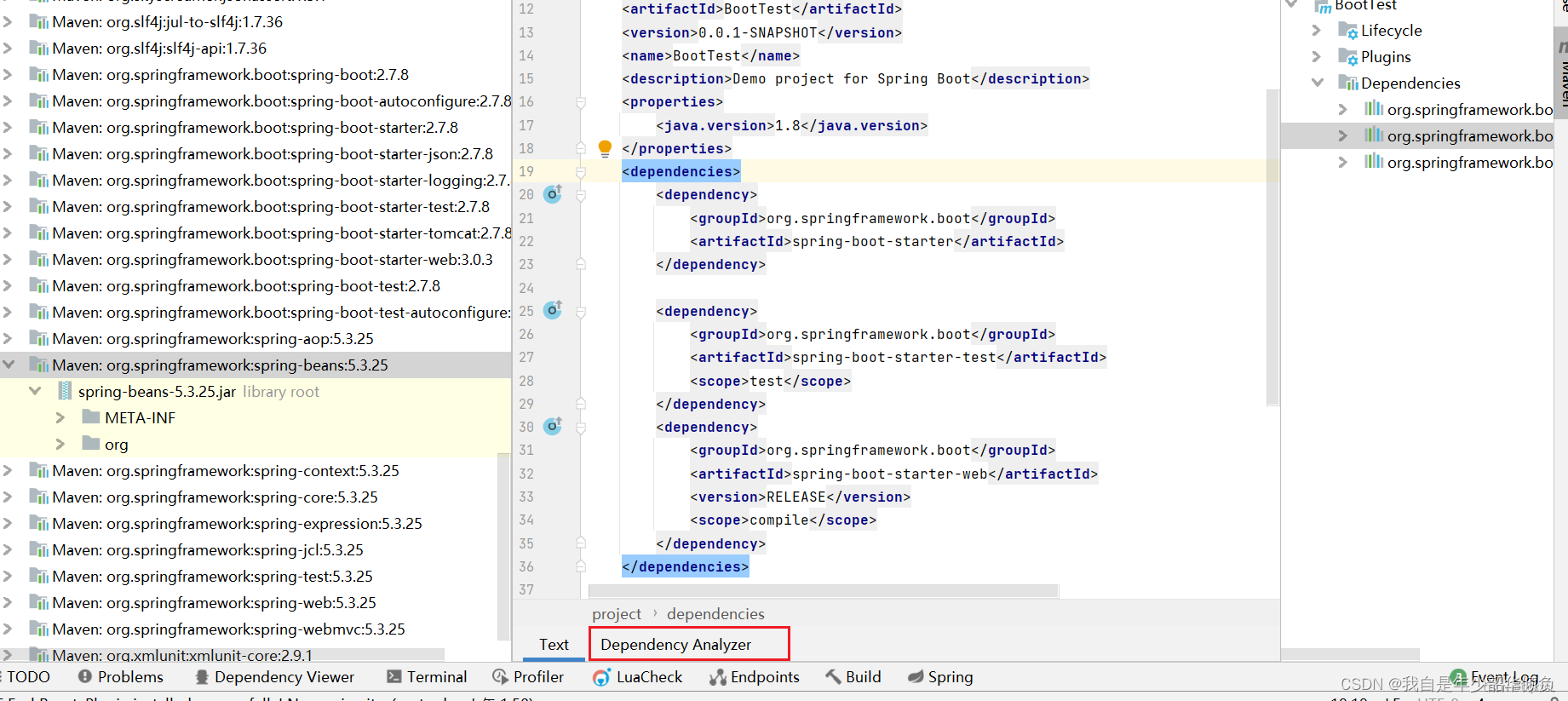 定位到项目所在的 pom 文件中,然后打开底部的 Dependency Analyzer
