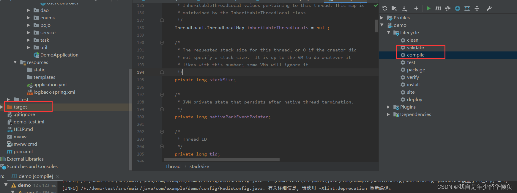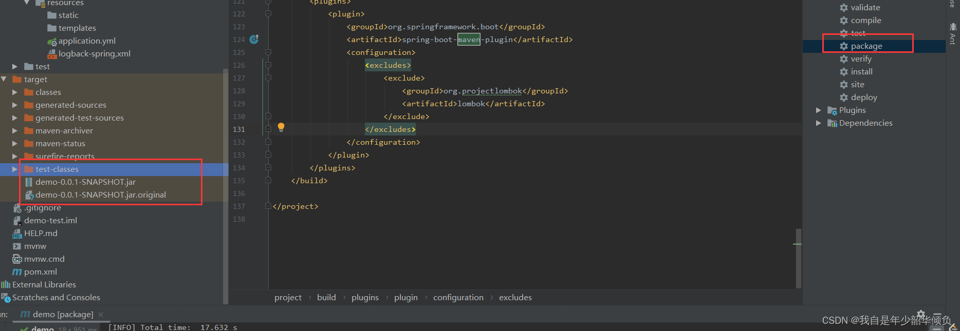 打包文件并存放到项目的target 目录下,打包好的文件通常都是编译后的class 文件