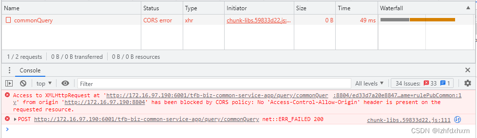 而浏览器显示的错误是CORS跨域,这就涉及到浏览器的跨域资源共享(CORS)、同源策略规则了: