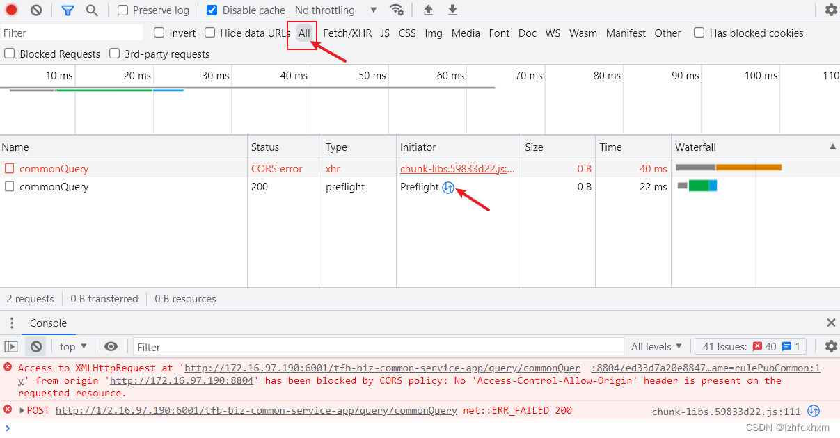 还有一个问题,这种复杂请求,是会先发送预检请求的(OPTIONS),可以通过在浏览器网络选项卡里的筛选设置选中All来查看所有的请求: