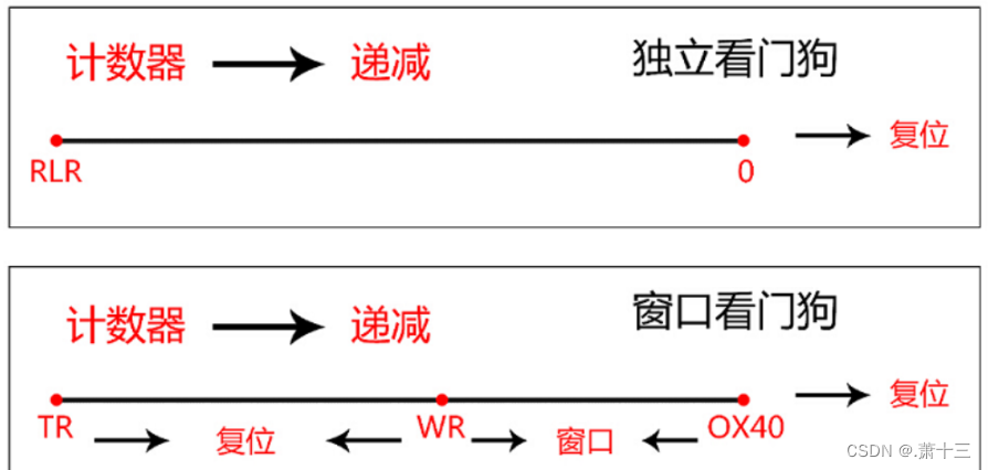 RLR 是重装载寄存器,用来设置独立看门狗的计数器的值。TR 是窗口看门狗的计数器的值,由 用户独立设置,WR 是窗口看门狗的上窗口值,由用户独立设置。