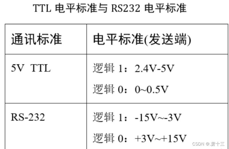 TTL 的电平标准,理想状态下,使用 5V 表示二进制逻辑 1,使用 0V 表示逻辑 0;而为了增加串口通讯的远距离传输及抗干扰能力,它使用-15V 表示逻辑 1,+15V 表示逻辑 0,即RS232。