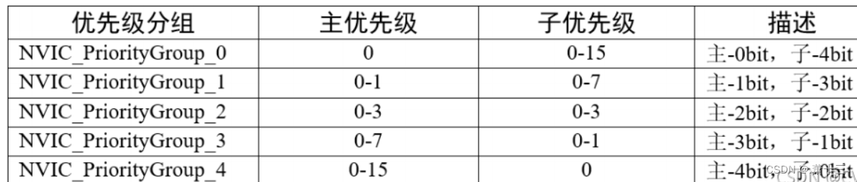 优先级的分组由内核外设 SCB 的应用程序中断及复位控制寄存器 AIRCR 的 PRIGROUP[10:8] 位 决定,F103 分为了 5 组,具体如下:主优先级 = 抢占优先级。