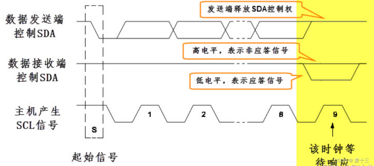 传输时主机产生时钟,在第 9 个时钟时,数据发送端会释放 SDA 的控制权,由数据接收端控制 SDA,若 SDA 为高电平,表示非应答信号 (NACK),低电平表示应答信号 (ACK)。