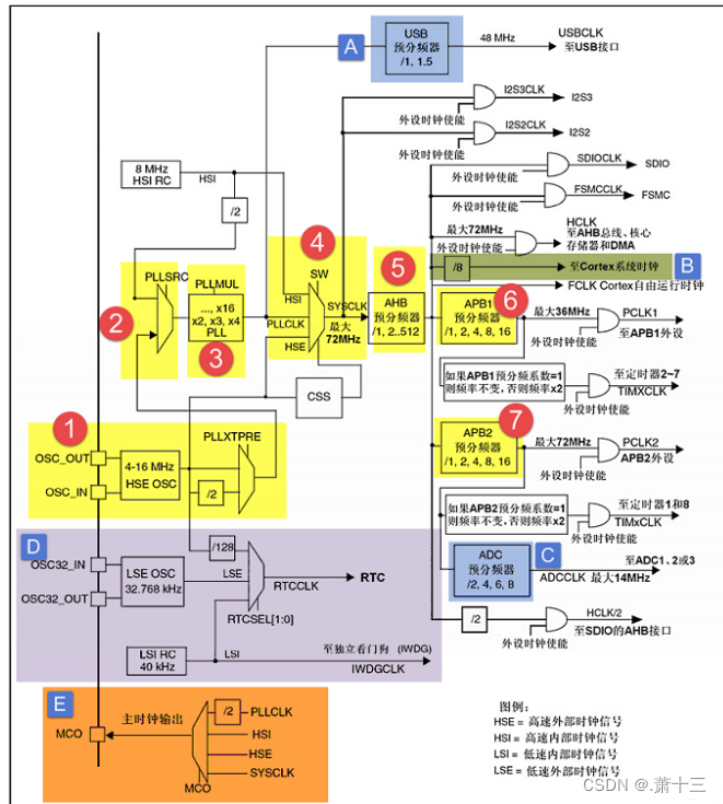 RCC时钟的主要作用:设置系统时钟 SYSCLK 、设置 AHB 分频因子(决定 HCLK 等于多少)、设置 APB2 分频因子(决定 PCLK2 等于多少)、设置 APB1 分频因子(决定 PCLK1 等于多少)、设置各个外设的分频因子;控制 AHB 、 APB2 和 APB1 这三条总线时钟的开启、控制每个外设的时钟的开启。 对于 SYSCLK、HCLK、PCLK2、PCLK1 这四个时钟的配置一般是:PCLK2 = HCLK = SYSCLK=PLLCLK = 72M, PCLK1=HCLK/2 = 36M。(以stm32f103vet6为例)