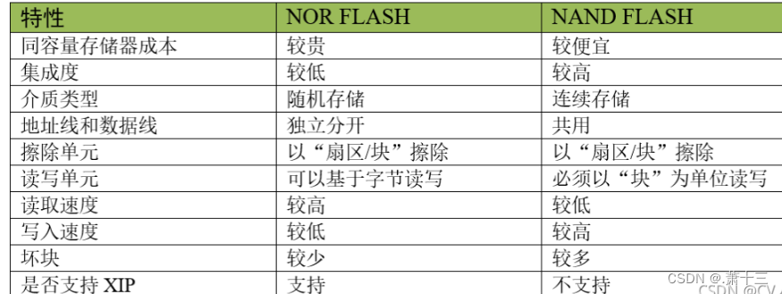 FLASH 存储器又称为闪存,它也是可重复擦写的储器,部分书籍会把 FLASH 存储器称为 FLASH ROM,但它的容量一般比 EEPROM 大得多,且在擦除时,一般以多个字节为单位。根据存储单元电路的不同,FLASH 存储器又分为 NOR FLASH 和 NAND FLASH。