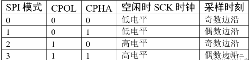 由 CPOL 及 CPHA 的不同状态,SPI 分成了四种模式,见表 SPI 的四种模式 ,主机与从机需要工 作在相同的模式下才可以正常通讯,实际中采用较多的是“模式 0”与“模式 3”