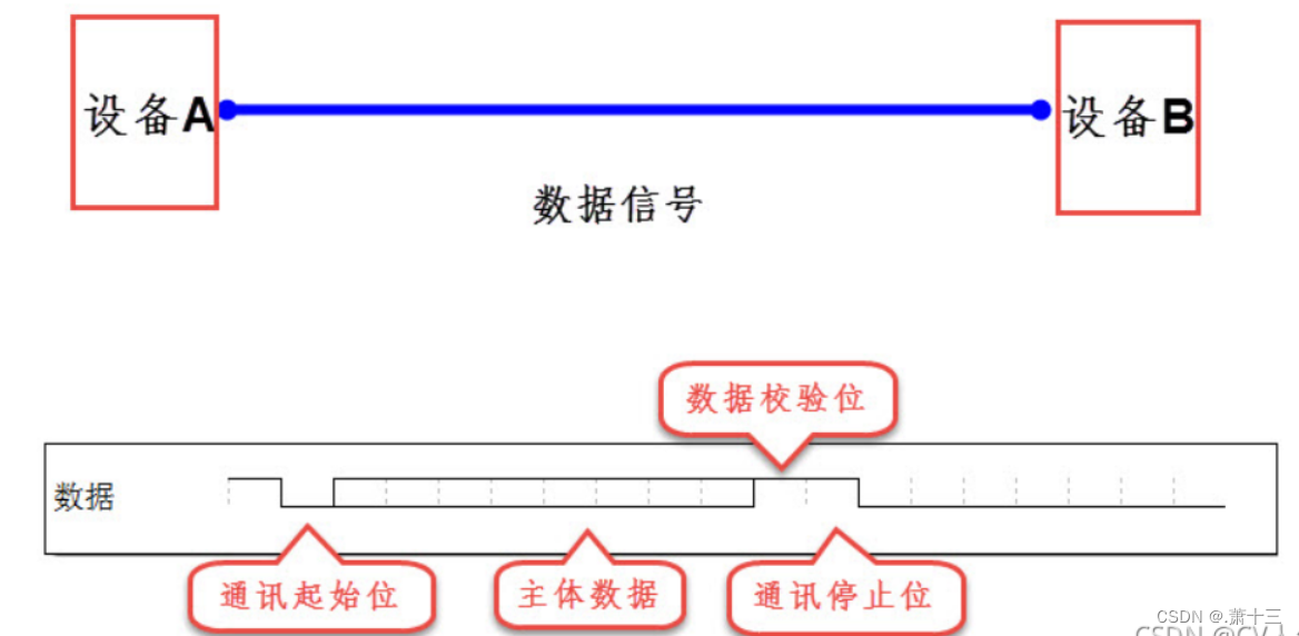 在异步通讯中不使用时钟信号进行数据同步,它们直接在数据信号中穿插一些同步用的信号位, 或者把主体数据进行打包,以数据帧的格式传输数据,见图某种异步通讯 ,某些通讯中还需要双方约定数据的传输速率,以便更好地同步。