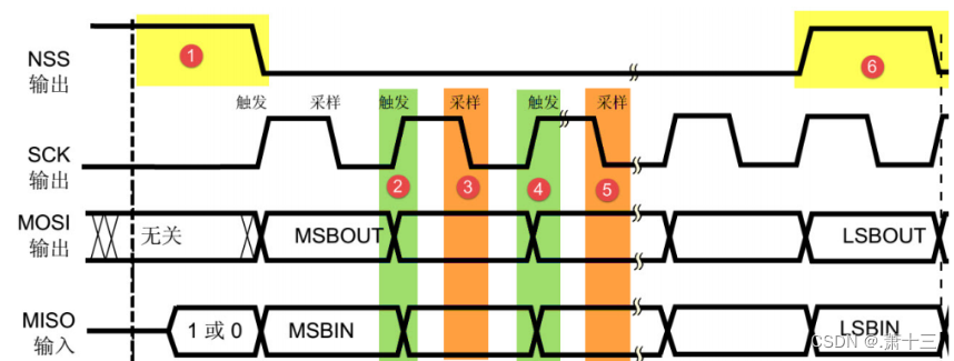 NSS 信号线由高变低,是 SPI 通讯的起始信号。NSS 是每个从机各自独占的信号线,当从机在自己的 NSS 线检测到起始信号后,就知道自己被主机选中了,开始准备与主机通讯。NSS 信号由低变高,是 SPI 通讯的停止信号,表示本次通讯结束,从机的选中状态被取消。