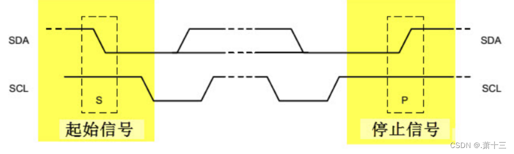 当 SCL 线是高电平时 SDA 线从高电平向低电平切换,这个情况表示通讯的起始。当 SCL 是高电平时 SDA 线由低电平向高电平切换,表示通讯的停止。起始和停止信号一般由主机产生。