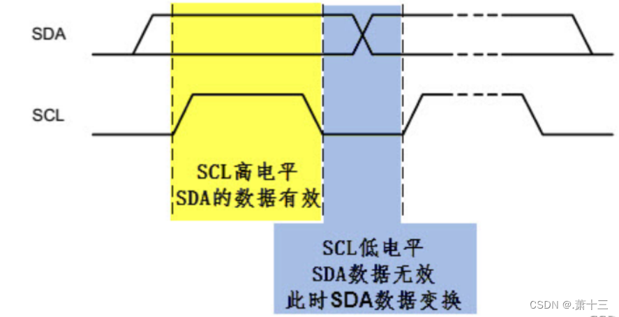 SDA 数据线在 SCL 的每个时钟周期传输一位数据。传输时,SCL 为高电平的时候 SDA 表示的数据有效,即此时的 SDA 为高电平时表示数据“1”,为低电平时表示数据“0”。当 SCL 为低电平时,SDA的数据无效,一般在这个时候 SDA 进行电平切换,为下一次表示数据做好准备。