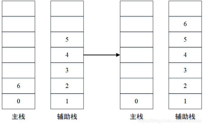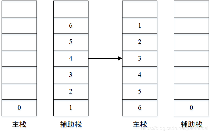 (7)接下来处理主栈中的最后一个元素0,因为其小于辅助栈中的所有元素,所以需要将辅助栈中的元素依次弹出压入主栈中,然后将元素0压入辅助栈中。