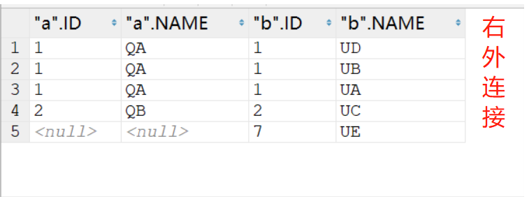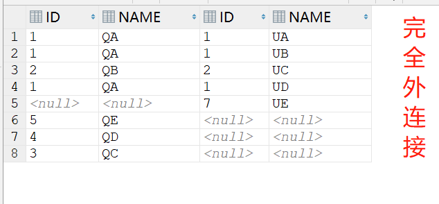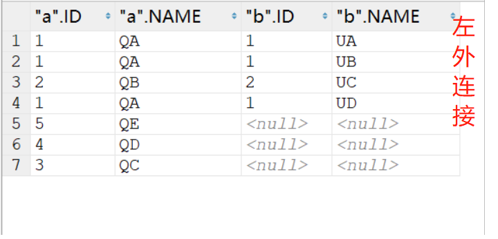 - Q1 返回的数据集是 6 行,表 a 中即使没有满足匹配条件的记录,查询结果中也会返回一行,并将表 b 的各个字段值填成 NULL。