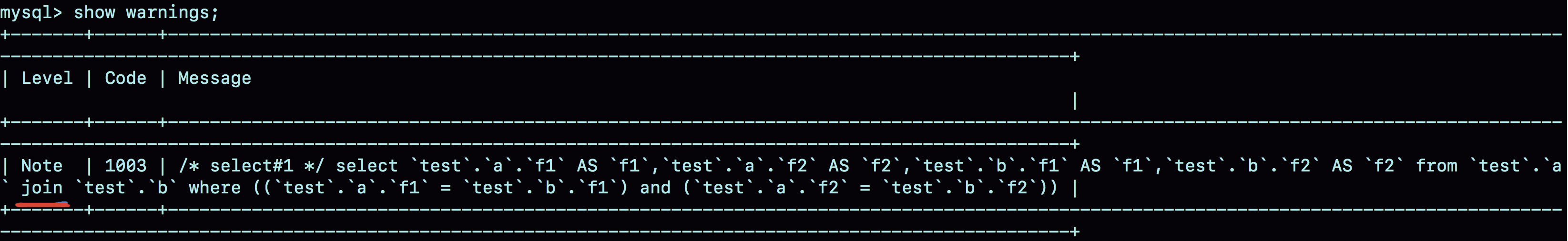 因此,优化器就把这条语句的 left join 改写成了 join,然后因为表 a 的 f1 上有索引,就把表 b 作为驱动表,这样就可以用上 NLJ 算法。在执行 explain 之后,再执行 show warnings,就能看到这个改写的结果,如图: