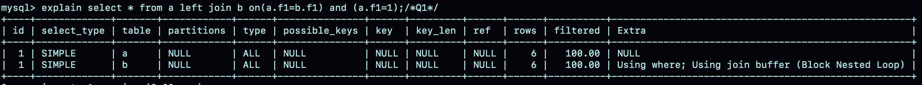 Q1 结果符合预期:驱动表是表 a,被驱动表是表 b。由于表 b 的 f1 字段上没有索引,所以使用的是 Block Nexted Loop Join(简称BNL) 算法。由此,这条语句的执行流程如下: