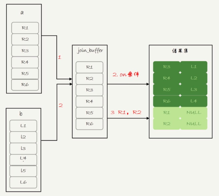 - 表 b 扫描完成后,对于没有被匹配的表 a 的行(也就是(1,1)、(2,2)这两行),把剩余字段补上 NULL,再放入结果集中。