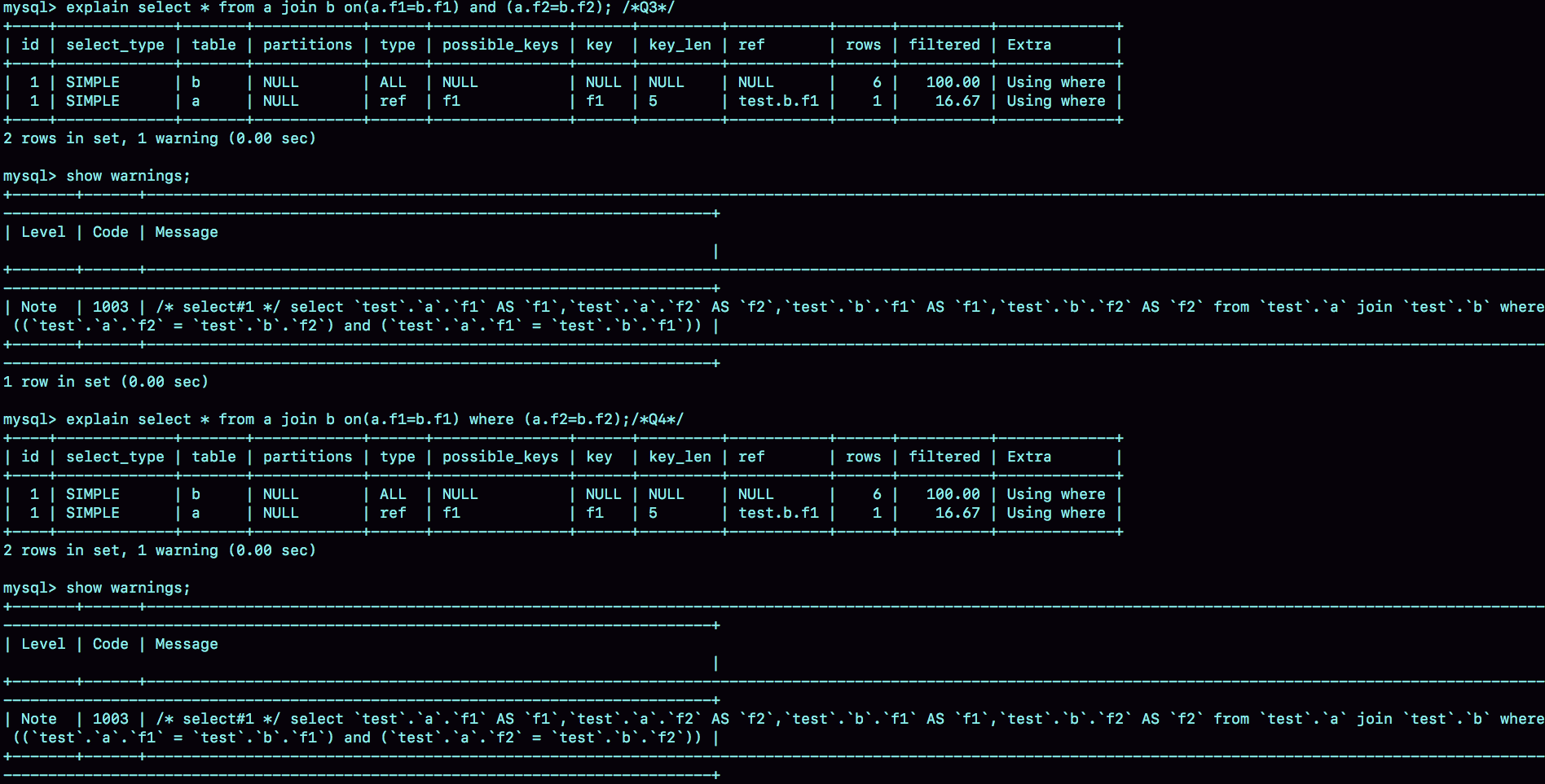 select * from a left join b on(a.f1=b.f1) where (a.f2=b.f2);/*Q2*/