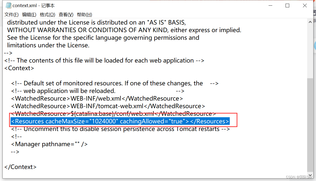 打开tomcat的conf/context.xml文件,添加如下语句: