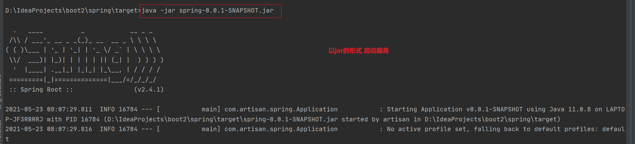 使用-jar参数时,后面的参数是的jar 【spring-0.0.1-SNAPSHOT.jar】,该jar文件中包含的是class和资源文件; 在manifest文件中有Main-Class的定义;Main-Class的源码中指定了整个应用的启动类;