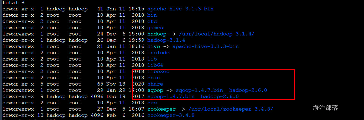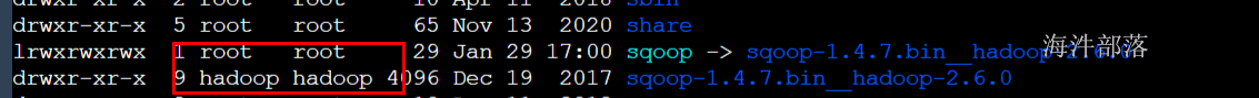 ln -s sqoop-1.4.7.bin__hadoop-2.6.0/ sqoop