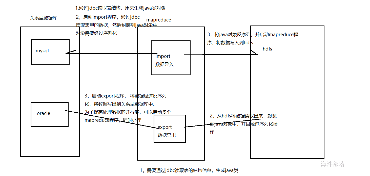 - sqoop通过jdbc读取关系型数据库元数据,获取到表结构信息,生成Java类。