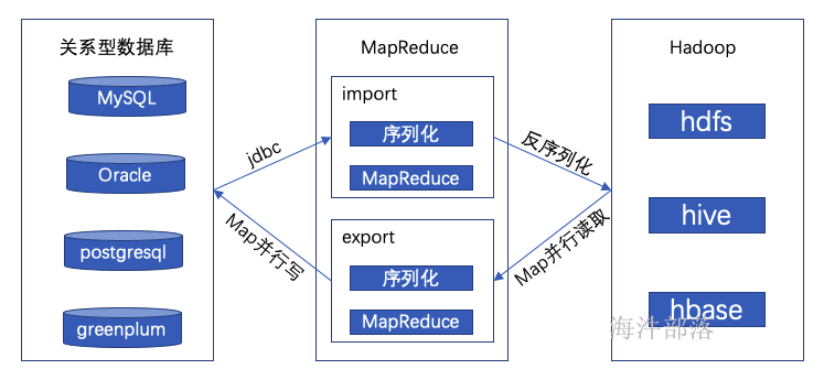导出数据:从hadoop的文件系统中导出数据到关系型数据库中。