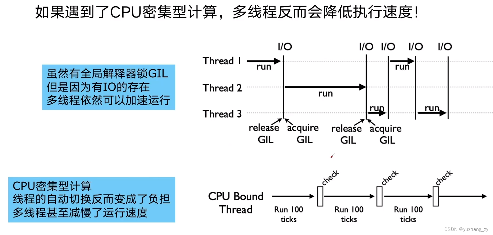 1. 有了多线程threading,为什么还要用多进程multiprocessing,虽然对于IO 密集型来说多线程确实可以实现加速的效果,因为当遇到IO的时候cpu会切换到另外的线程,此时当前的线程可以执行当前的IO操作,这样就实现了多线程加速的效果,但是当遇到的是cpu 密集型来说,没有IO的操作,当一个线程执行一段时间之后那么切换到其他的线程,此时会发生线程切换的消耗,非但没有实现加速的效果,返回减慢了运行速度;而multiprocessing 模块就是为了python 为了解决GIL 缺陷而引入的一个模块,原理是在用多进程在多cpu 上并行执行;
